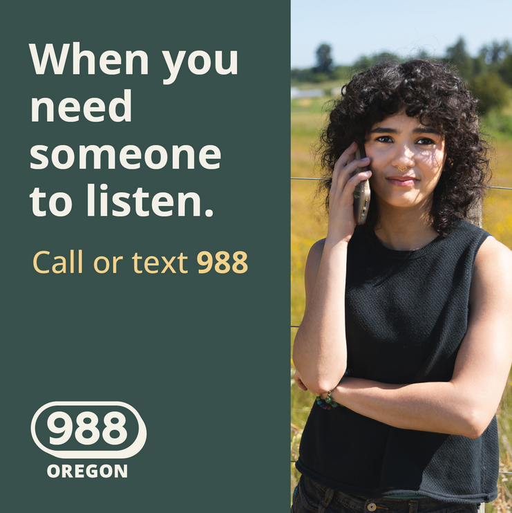988 Oregon is a free, confidential phone line that you can call anytime you are feeling overwhelmed, lonely, or just in need of someone to talk to. Support is available 24 hours a day via phone call, text, and online chat.
